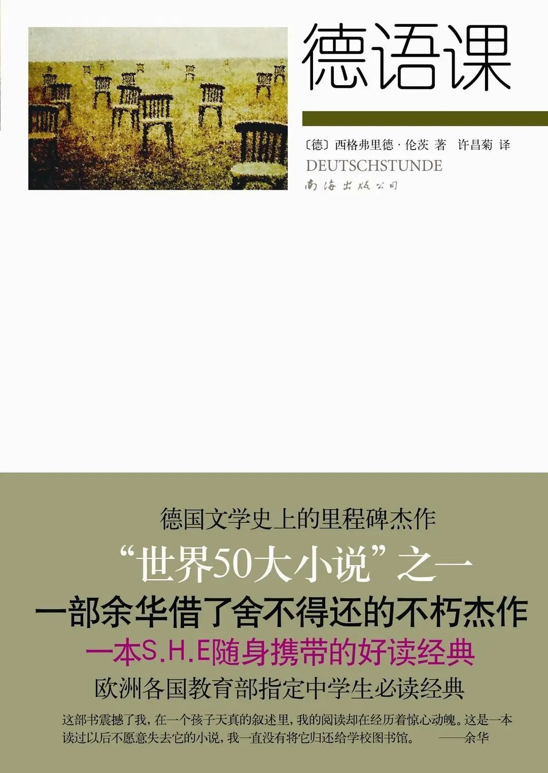 “我第一次读到伦茨的小说是《面包与运动》,第二次就是这部《德语课》。那时候我在鲁迅文学院,我记得当时这部书震撼了我,在一个孩子天真的叙述里,我的阅读却在经历着惊心动魄。这是一本读过以后不愿意失去它的小说,我一直没有将它归还给学校图书馆。这书是八十年代翻译成中文出版的,当时的出版业还处于计划经济时代,绝大多数的书都是只有一版,买到就买到了,买不到就永远没有了。我知道如果我将《德语课》归还的话,我可能会永远失去它。我一直将它留在身边,直到毕业时必须将所借图书归还,否则就按书价的三倍罚款。我当然选择了罚款,我说书丢了。我将它带回了浙江,后来我定居北京时,又把它带回到了北京。”
