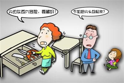 危险物品如剪刀、刀子以及各种工具,都要收到带锁的柜子里,或是孩子拿不到的地方。许多家长有随意放东西的习惯,危险的物品要专门存放,避免给孩子带来意外伤害的机会。
