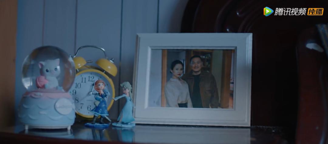 在向东的出租房,卧室桌上有一堆公仔摆件,放在向东与女朋友相框前。