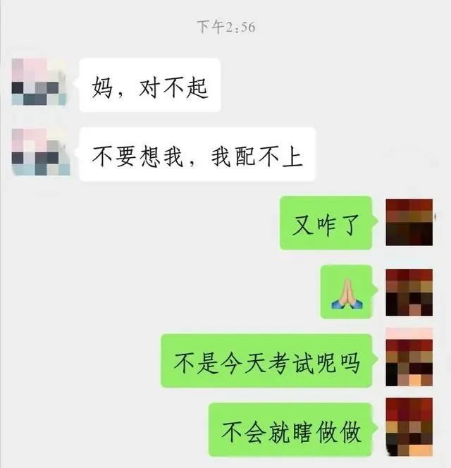 离开考场后,考生给母亲发了条微信:妈,对不起,不要想我,我配不上。