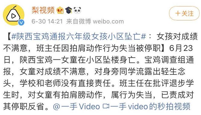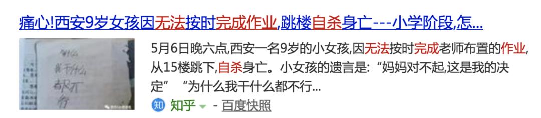 再比如在陕西宝鸡,一个“从幼儿园开始奖状就没有断过”的六年级女孩,因为对成绩不满意对身旁同学流露出轻声念头,最后在小区坠楼身亡。