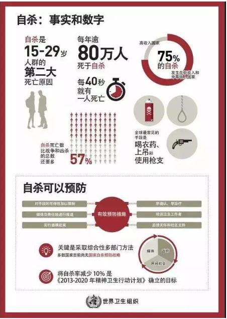 事实上,自杀,已成为全球15—29岁年龄组人群的第二大死亡原因,10—14岁年龄人群中第三位的致死原因[1]。 抑郁症状,长期的负面生活堆积的压力,熟悉的人有自杀行为等几大要素都是自杀的诱因。
