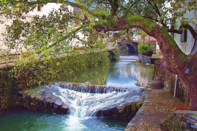整个村落因地势而建,错落有致,许多建筑更是横跨于溪桥之上。一水而流,两岸青瓦,三点繁花,四时各异。市井却不喧闹,安静并不寂寞。