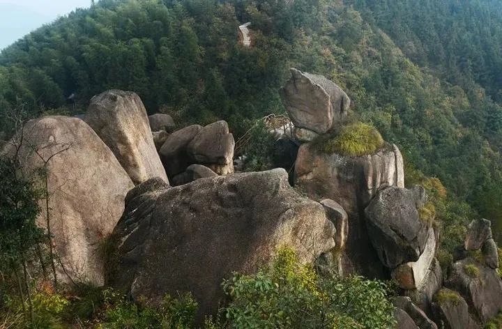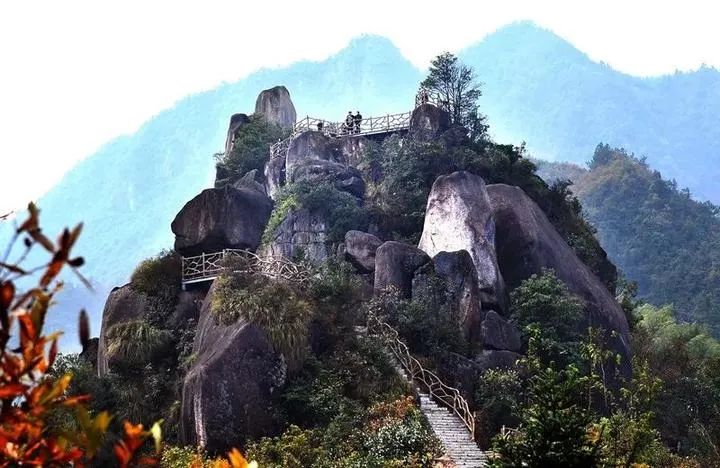 灵江源森林公园险峰耸立,绝壁千仞。行走其间,还真有行走在蜀道之上的那种感觉,特别是那段栈道,回环于半山腰之上,脚下是碧涛翻滚的林海松阵,头顶是垂悬欲倾的绝壁险峰。