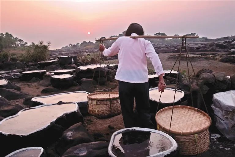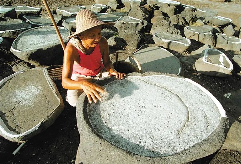 古人早就体会到“无盐则肿”,人若长期淡食则全身浮肿,四肢乏力。海南岛上的原始居民,在海浪迸溅的礁石坑凹处可捡到晒成薄片状的白色结晶体,他们尝试用来烹调食物感觉味道咸美,活力倍增。后来,他们只要将自然蒸发到一定浓度的卤水舀到石坑处暴晒,或用釜器烧煎,就可以收获需要的盐巴,正如许慎《说文解字》所言:盐,“卤也,天生曰卤,人生曰盐”。