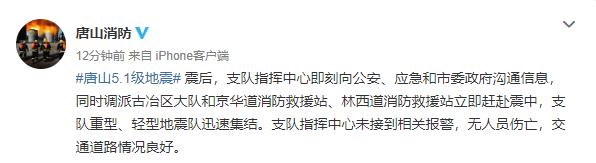 据@唐山消防,震后,支队指挥中心即刻向公安、应急和市委政府沟通信息,同时调派古冶区大队和京华道消防救援站、林西道消防救援站立即赶赴震中,支队重型、轻型地震队迅速集结。支队指挥中心未接到相关报警,无人员伤亡,交通道路情况良好。