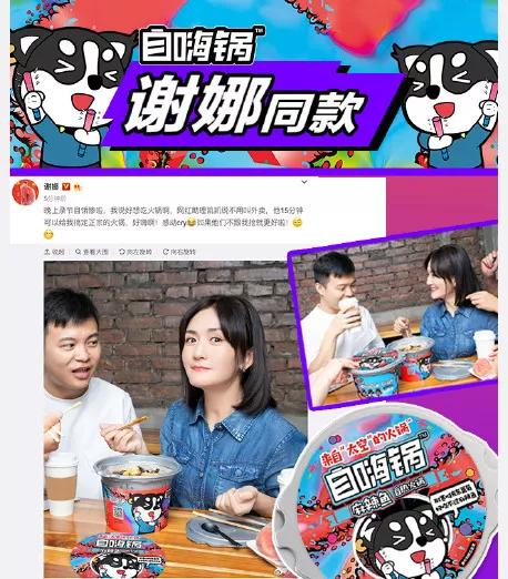 另一方面,铺天盖地的营销也是打造网红产品的必要手段。仅自嗨锅一个品牌,就先后在《高能少年团》《少年派》《安家》《囧妈》等综艺节目和影视作品中做过植入,谢娜、林更新、华晨宇等明星也都为它站台,发过吃自嗨锅的微博。