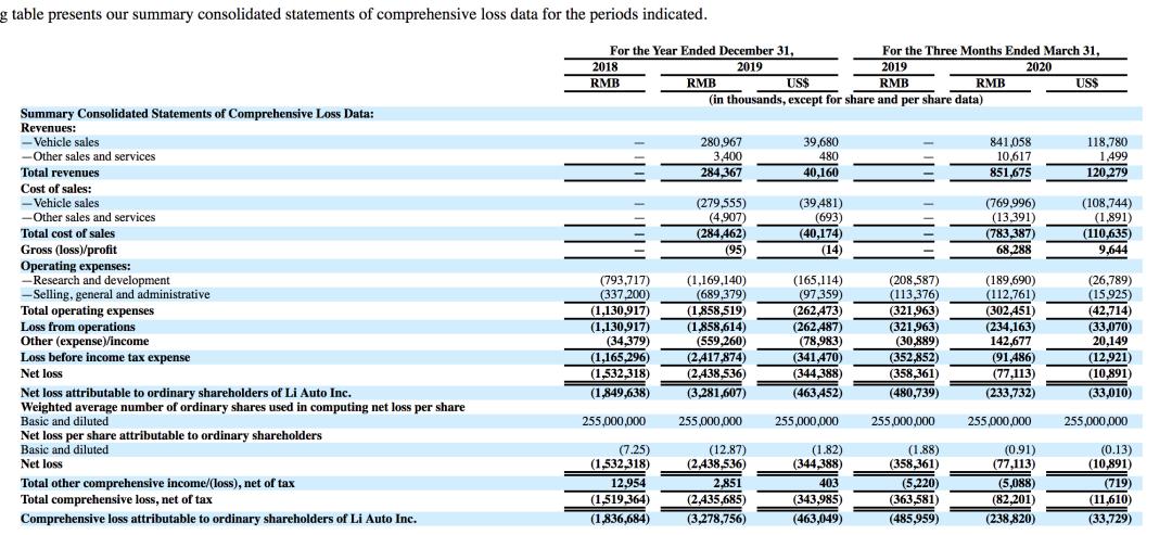 根据招股书,理想汽车2018年无营收,净亏损为15.32亿元(约2.22亿美元)。2019年总营收为2.844亿元(约合4020万美元),净亏损约为24.38亿元(约3.44亿美元)。2020年一季度,总营收为8.517亿元(约合1.2亿美元),净亏损约为7711万元(合1089万美元)。