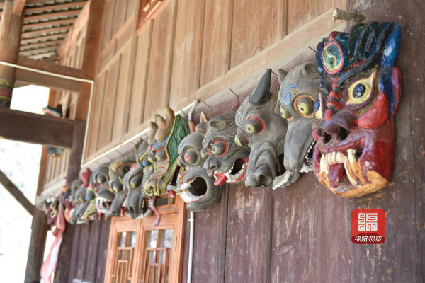 扒昔加古寨里,一个写着“铁匠铺”的小院屋门大开,里面一壁彩色面具栩栩如生,这是村民田虎塔打造及存放“曹盖”面具的地方。44岁的田虎塔是平武县级曹盖制作“非遗”传承人。他的父亲旭仕修也是白马文化“非遗”传承人。屋里挂着的一张珍贵老照片,拍摄于1979年的人民大会堂,是旭仕修当年参加全国少数民族代表大会的合影。田虎塔制作的曹盖面具,雕刻“十二生肖”和鬼神形象,怒目圆睁,仿佛要吞噬一切邪祟。“在我们白马传统观念里面,曹盖面具有灵性,其面具越丑恶,驱邪效果越好。”田虎塔说,他家做的曹盖面具很受欢迎,远道而来的影视剧导演、大学教授,研究曹盖的文物专家,都来拜访过。对田虎塔而言,曹盖是白马文化灵魂之一,他要将这灵魂不断熔铸进用手雕刻的面具里。
