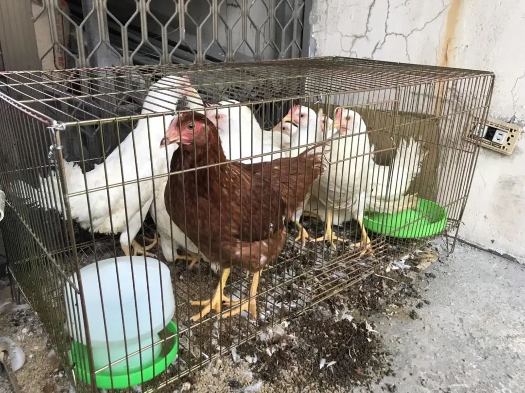 去年四月,他们领养了10只被蛋鸡场淘汰、两个月大还不会生蛋的母鸡,放在家中顶楼,方便就近照顾。九只白色,一只咖啡色,亮绿色的自动饮水桶及饲料桶,一同被关在一个狭窄的铁笼里。