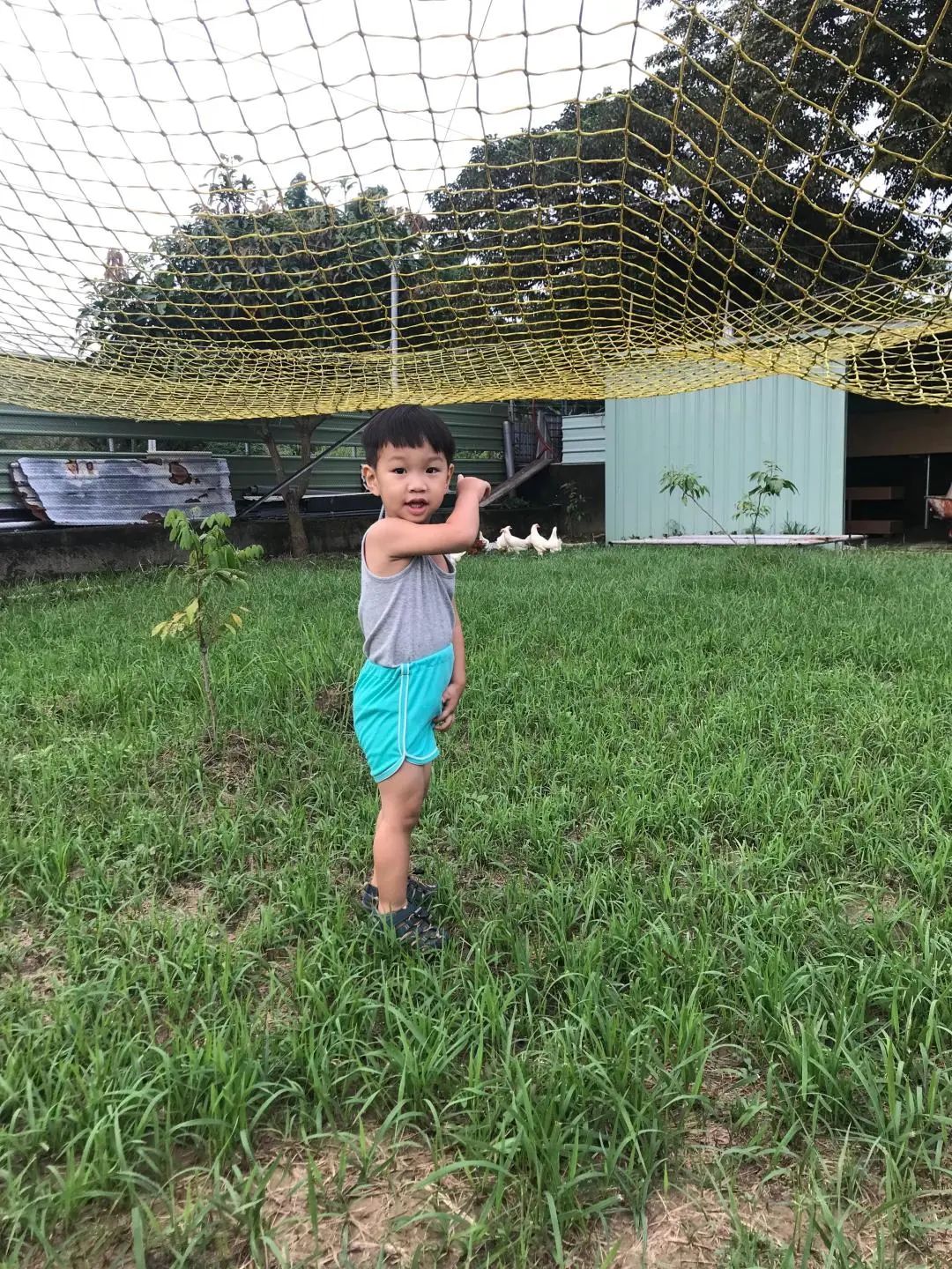 爸把这片闲置草地画分成两区块,小的区块用黑网四面八方围起,专养母鸡,并盖了间阳春铁皮房,钉上木柜子铺上米糠成母鸡产房。和天空连接处,铺上天罗地网,减少野鸟偷吃饲料。种下几株百香果树苗,引导它在网上攀藤为母鸡遮荫。