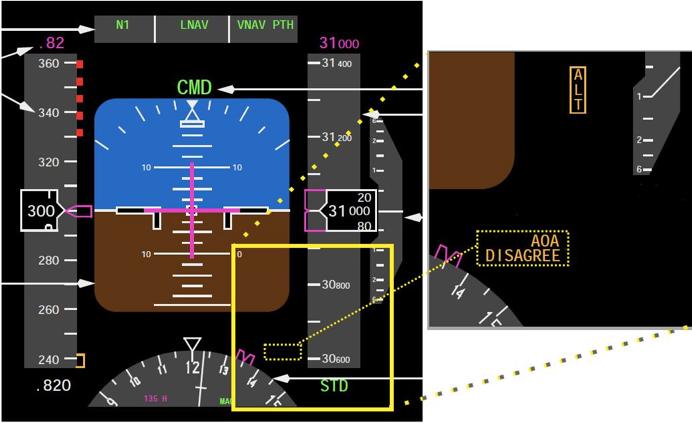 民航中迎角传感器出现故障并不罕见。以目前使用最广的波音737NG为例,若发生两个迎角传感器读数偏差过大,会出现提示“AOA disagree alert”(迎角不一致警告),以提醒飞行员两个迎角传感器读数有较大偏差。