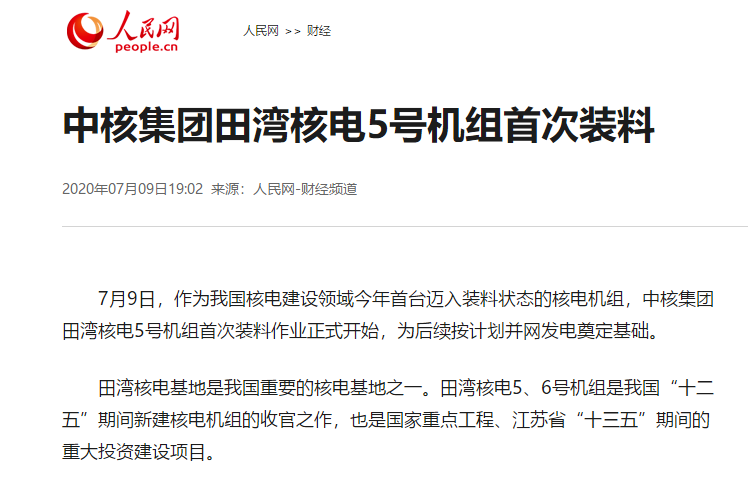 人民网:中核集团田湾核电5号机组首次装料http://finance.people.com.cn/n1/2020/0709/c1004-31777800.html