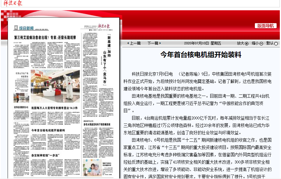 《科技日报》:2020年首台核电机组开始装料http://digitalpaper.stdaily.com/http_www.kjrb.com/kjrb/html/2020-07/10/content_448409.htm?div=-1
