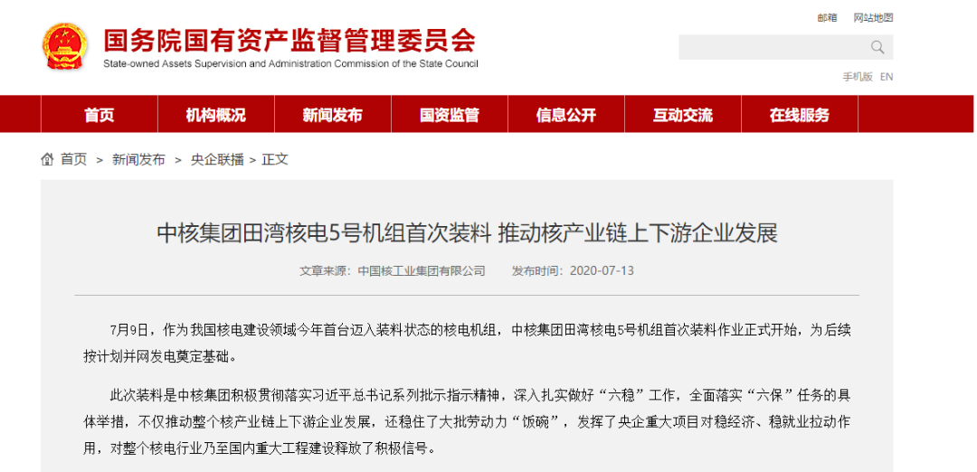 国资委网站:中核集团田湾核电5号机组首次装料 推动核产业链上下游企业发展http://www.sasac.gov.cn/n2588025/n2588124/c15074077/content.html