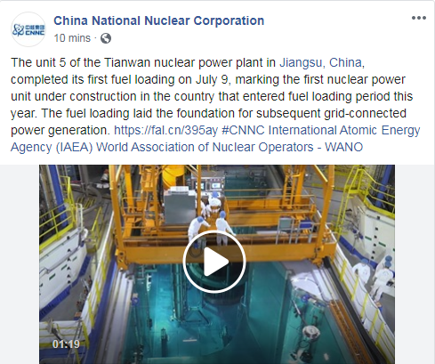 https://www.facebook.com/ChinaNationalNuclear/videos/1136503966730620/中核集团脸书账号:The unit 5 of the Tianwan nuclear power plant in Jiangsu, China, completed its first fuel loading on July 9, marking the first nuclear power unit under construction in the country that entered fuel loading period this year. The fuel loading laid the foundation for subsequent grid-connected power generation.