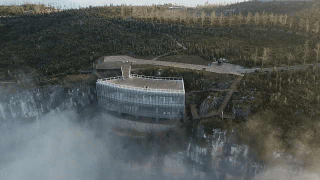 贵州黔西南布依族苗族自治州安龙县有一座溶岩美术馆,嵌在约165米高悬崖的自然凹槽内,从美术馆向外望去,就是悬崖峭壁。你敢来,我就敢建,真·艺术就是心跳啊。