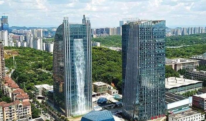 裂变大厦的人工瀑布远看像条飘逸的白绢,正下方是大型蓄水池。据介绍,开放时,需要4台185千瓦的大型抽水泵抽至高层,每次喷水蓄水要超过两小时,算下来开放一小时至少花800块钱以上电费。