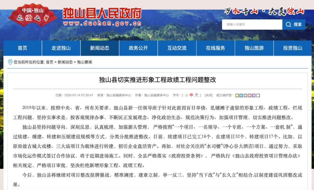 今日(14日),独山县人民政府网站发布《独山县切实推进形象工程政绩工程问题整改》一文,回应社会关注的纪录片“独山县如何烧掉400亿”一事。