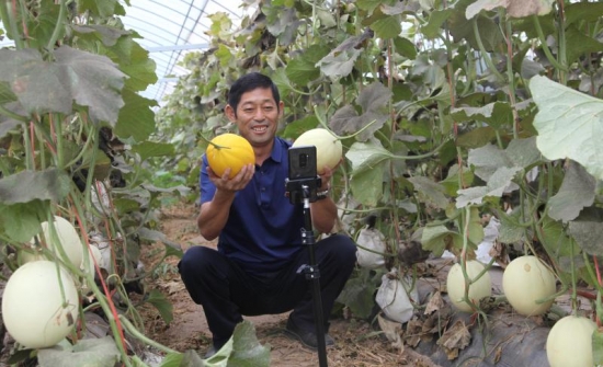 “我是杞县柿园乡万寨村党支部书记杜振远,我们村种植的蜜瓜,入口绵甜、肉质鲜嫩、甜润宜人,是真正的瓜中鲜品!”7月12日,雨如同满天发亮的珍珠,飘飘洒洒,点滴入土,滋润着河南杞县1243平方公里的沃土。在杞县柿园乡万寨村蜜瓜产业园的种植大棚内,村党支部书记杜振远在网络直播的三角架前,一手托着俏“玉菇”,一手托着“金香玉”新鲜蜜瓜,闻味道、说成色、尝口感,用地域味较深的“普通话”细致入微地描述蜜瓜的实物品相,让在看网络“带货直播”的观众们不禁闻香而动。