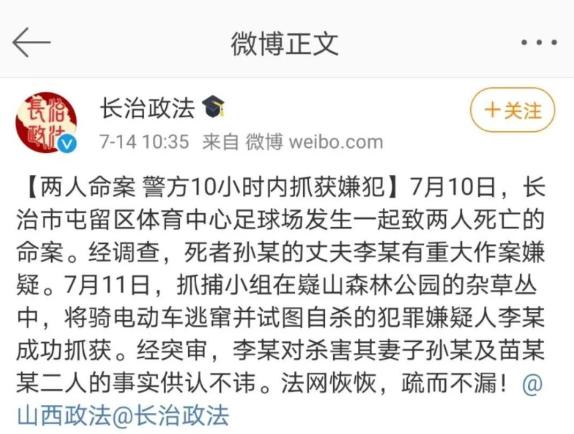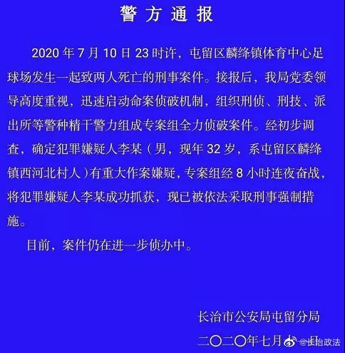 7月10日22时许,山西省长治市屯留区体育中心足球场发生一起致两人死亡的命案。