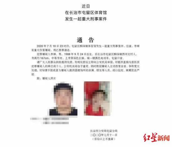记者注意到,7月11日,公安屯留分局曾发布通告指出,犯罪嫌疑人李某畏罪潜逃时上身穿深色长袖,骑着一辆黑色电动车。