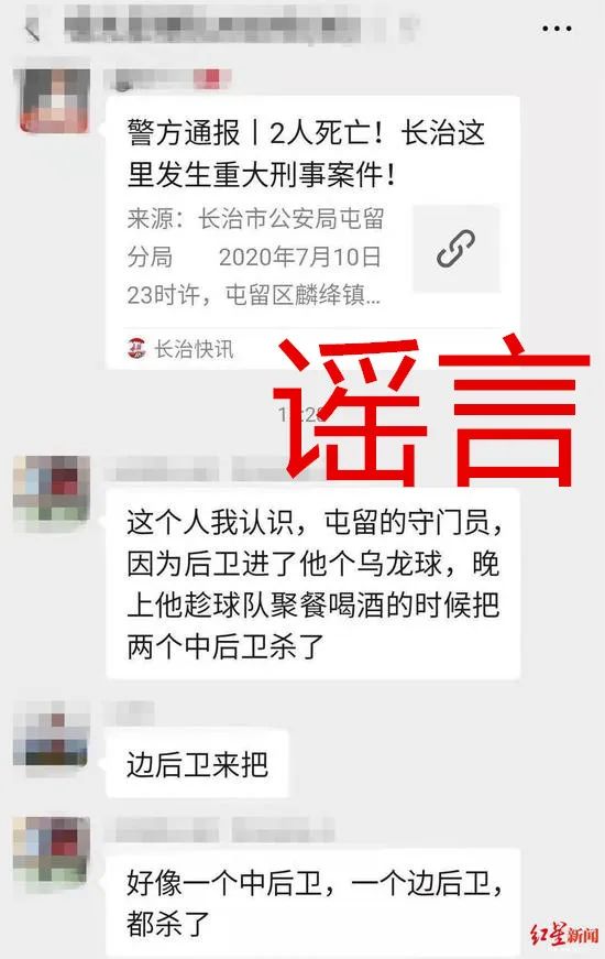 而在当地某业余足球队的微信群里,有网友“爆料”称,犯罪嫌疑人是一个守门员,因为本队后卫进了乌龙球,晚上趁球队聚餐喝酒的时候把两个后卫杀了!这名网友还表示:“刚才问了一下屯留的,因为那个后卫喜欢在禁区里带球,被对方前锋断球后射门。”