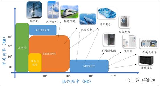根据功率半导体开关功率、操作频率的不同,其具体的应用领域也有较大的差别,具体如下图所示: