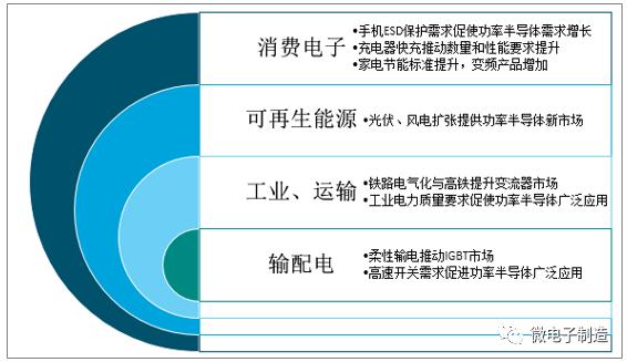 随着世界各国对节能减排的需求越来越迫切,功率半导体器件已从传统的工业控制和4C(通信、计算机、消费电子、汽车)领域迈向新能源、轨道交通、智能电网、变频家电等诸多产业。功率半导体的发展使得变频设备广泛的应用与日常的消费,促进了清洁能源、电力终端消费、以及终端消费电子的产品发展。