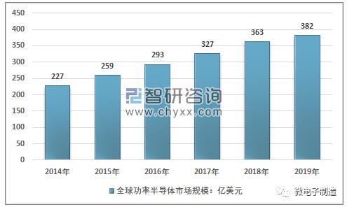 近年来,随着电子制造业的持续发展,电力终端消费增加,电气化,自动化发展迅速,2014年全球功率半导体市场规模仅为227亿美元,2018年增长至363亿美元。受益于折旧带来的替换市场、电气化程度加深带来的新增市场以及供需格局带来的价格增长,2016年—2018年全球功率器件市场增长迅速,2019年行业增长速度有较为明显的放缓,主要受中美贸易战,全球经济下行压力增加,中国新能源汽车市场回落等诸多因素影响,全年市场规模约为382亿美元。