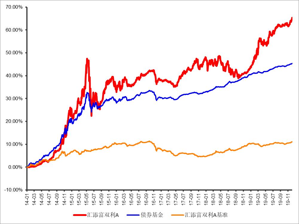 风险提示:汇添富双利债券A成立于2011/1/26,业绩比较基准为中债综合指数 。截至2019/12/31,A份额回报为65.35%,同期业绩基准回报为11.12%。A份额历史各年该产品及业绩基准回报为:21.75%/5.71%、14.31%/4.19%、-0.88%/-1.64%、4.91%/-3.39%、-2.15%/4.74%、16.76%/1.35%。汇添富双利债券属于较低风险等级(R2)产品,适合经客户风险承受等级测评后结果为稳健型(C2)及以上的投资者,客户-产品风险等级匹配规则详见官网。在代销机构申购时,应以代销机构的风险评级规则为准。