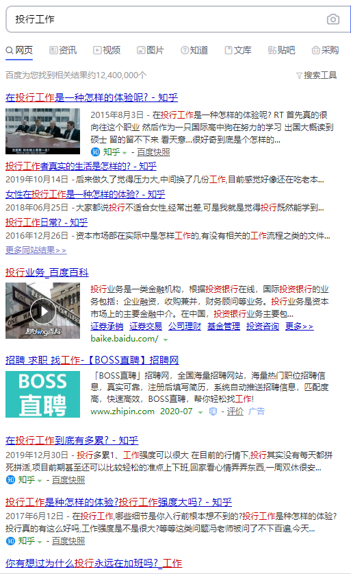 每年一到毕业季,“投行工作”就成了高频搜索词条。搜这个词出来的文章大致可以分成两个主题。一类是“在投行工作有多累”,正如下图所示。还有一类图片上虽然没显示出来,但搜索时往下拉拉就能看到:“如何才能进投行”。