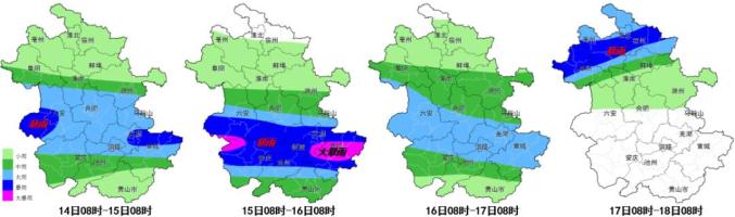 14-15日强降水主要位于沿淮到沿江地区,14日沿淮到沿江部分地区有大雨到暴雨;