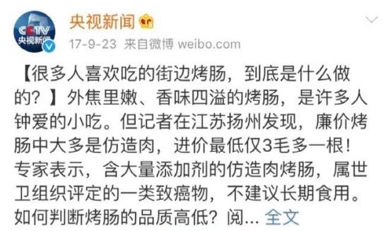 2017年9月,央视新闻就曾报道廉价烤肠的生产成本——仅仅3毛钱一根!这些廉价烤肠,为了所谓的颜色、口感和口味,大肆添加各种添加剂,密封性也是极差!