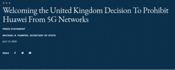 在特朗普发表这番露骨讲话稍早前,美国国务卿蓬佩奥就英国做出决定表示“欢迎”。其在声明中声称“欢迎英国计划禁止华为公司参与未来5G网络”、“(这)对跨大西洋安全与繁荣来说至关重要”。