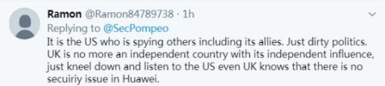 一位网友表示,“是美国在监视其他国家,包括它的盟友。(美国的所作所为)恰恰才是肮脏的政治。英国不再是一个拥有独立影响力的独立国家了,‘跪下来’听美国的话,即使英国知道华为并不存在安全问题。”