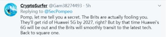 更有网友写道:“蓬佩奥,让我告诉你一个秘密。英国人其实是在愚弄你。他们会在2027年之前淘汰华为5G,对吗?但到那时,华为的6G将会推出,英国人将平稳过渡到最新的技术。让一切回到原点。”