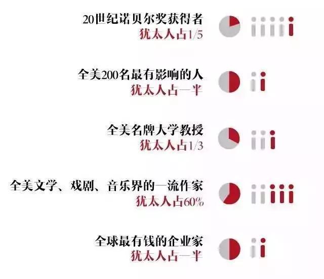 此外,在美国,超过三分之一的普利策奖和超过三分之一的奥斯卡奖的得主,是犹太人;占人口总数不足3%的犹太人,操纵者全美70%以上的财富;而如果再把过去两百年里在各行业里的涌现出的具有犹太血统的“天才”罗列出来,你可能会瞠目结舌。