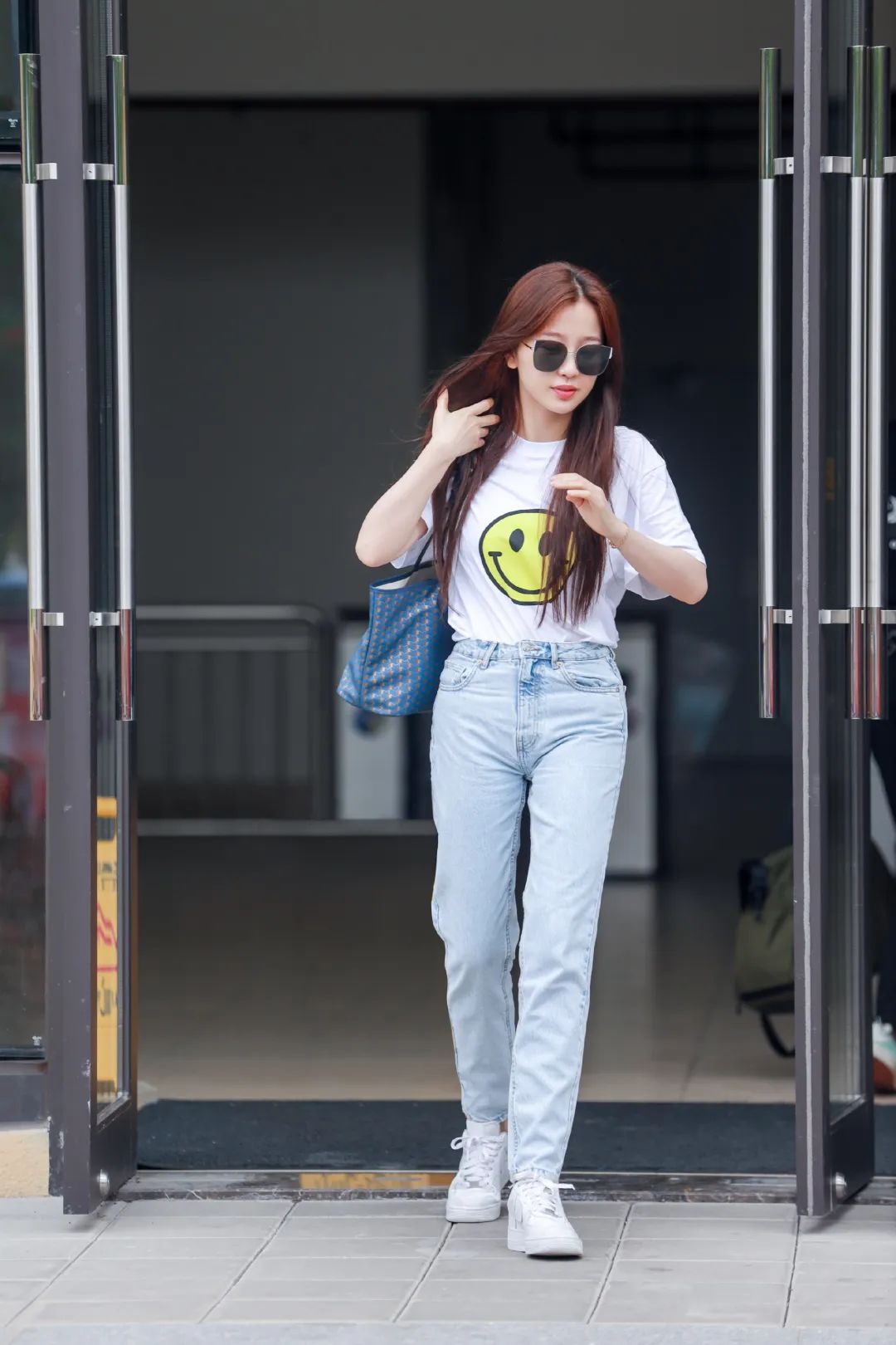 杨幂和周雨彤都是笑脸的包包款,荧光黄的颜色更显夏日活力满分。虞书欣和赵露思则是白T款,T恤搭配牛仔裤永远都不会错~