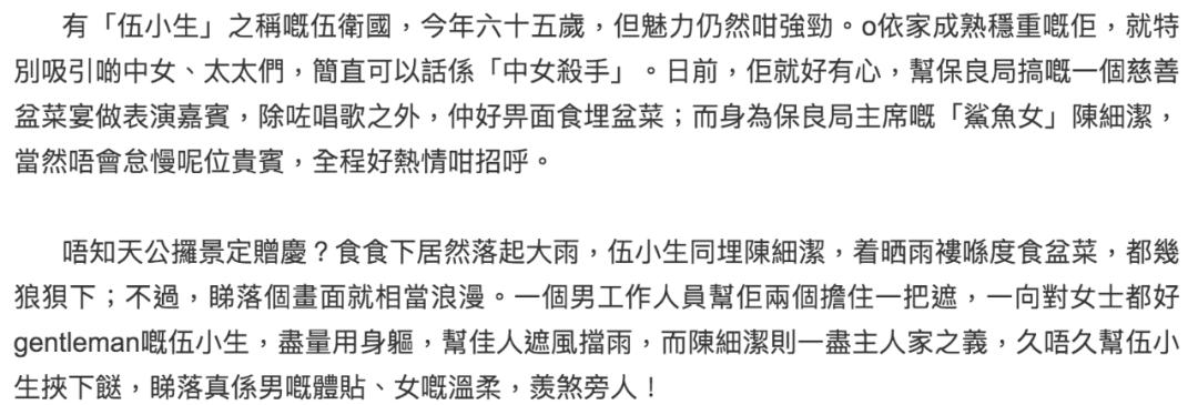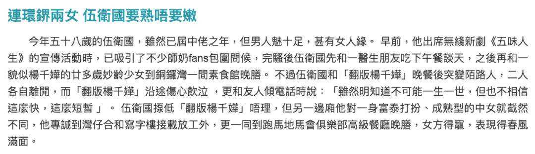 媒体经常拍到单身且聪明的伍卫国与不同女生相聚,而且多半是六零后七零后的熟女,大概因为他走红的时候是熟女们的情意结,可见私人生活还算颇为多姿多彩。