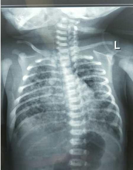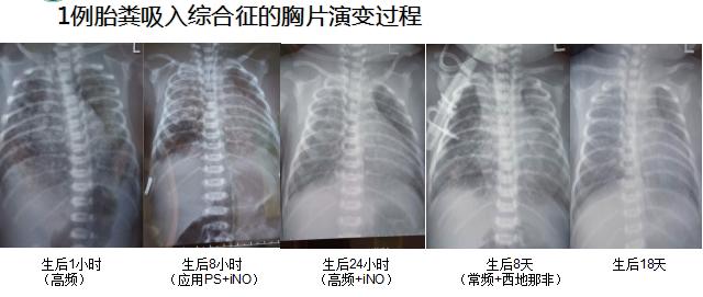 胸片显示双肺大量斑片状、粗颗粒状阴影伴肺气肿。结合病史,MAS诊断明确,随即进行插管、盐水气管内冲洗、滴入肺表面活性物质、上高频呼吸机等一系列急救处理。