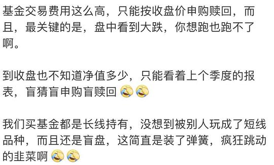 大V感概,“我们买基金都是长线持有,没想到被别人玩成了短线品种,而且还是盲盘,这简直是装了弹簧,疯狂跳动的韭菜啊”