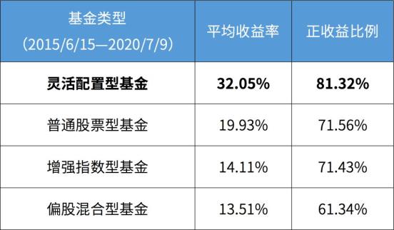 从2015年高点以来,截至7月10日,80%以上的灵活配置型基金取得正收益,平均收益率达32.05%。