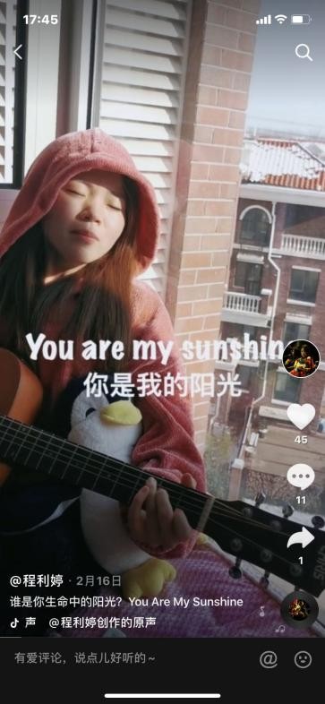 对于程利婷来说,隔离在家的这段时间终于让她有机会开始进行抖音短视频创作。“不抱怨,不励志,不煽情。只想与你分享生活,分享音乐,分享美好。”这25个字,是她给自己的账号作出的定位。