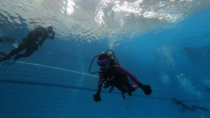 可没想到,第一次在泳池下水,过低的水温就让她不停地发抖。不合身的潜水设备也使得她在水下不停地翻个儿,整个人处于失控状态。开局不利,让利婷一次次产生放弃的念头。后来在开放水域练习,6月初长岛的海水仍然冷得刺骨,再加上浑浊不清的水质状况,第一次下海的她心理恐慌加倍。