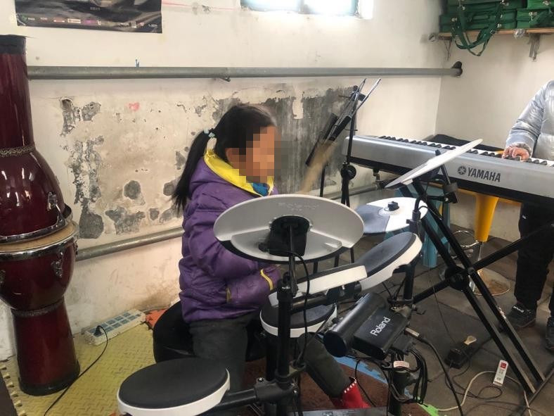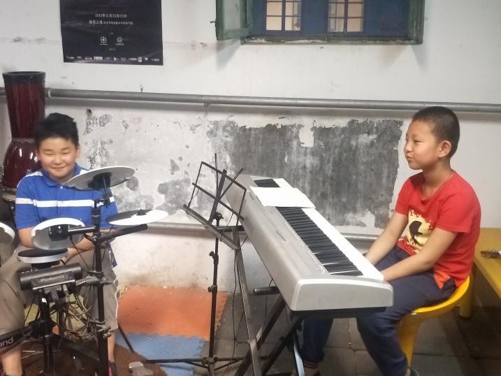 排练到一半,教室里又涌进来几个同学,排练完舞蹈、武术的他们继续投入到乐队排练中。人一下子多了起来,为了让每个同学都有乐器可练,谢老师不得不回家取吉他。