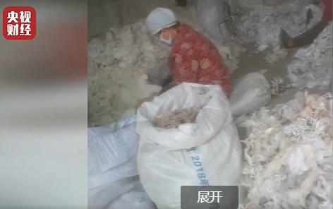 在河北邯郸南井寨村,这里生产再生棉的原料让人震惊。厂子里的旧衣服堆积如山,有毛衣、外套、秋衣秋裤,甚至穿过的内衣、袜子等。在没有经过任何消毒程序后,经过机器绞碎、几道开花程序,旧衣服重新变成了棉花,同时,产品包装上,依然没有任何警示标志。