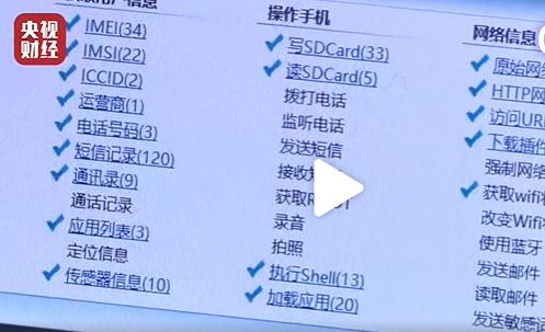 检测人员:“它会读取这部设备的IMEI、IMSI、运营商信息、电话号码、短信记录 、通讯录、应用安装列表和传感器信息。”