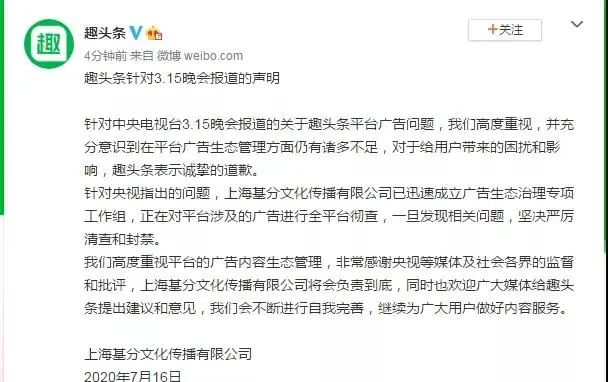 针对中央电视台3.15晚会报道的关于趣头条平台广告问题,我们高度重视,并充分意识到在平台广告生态管理方面仍有诸多不足,对于给用户带来的困扰和影响,趣头条表示诚挚的道歉。