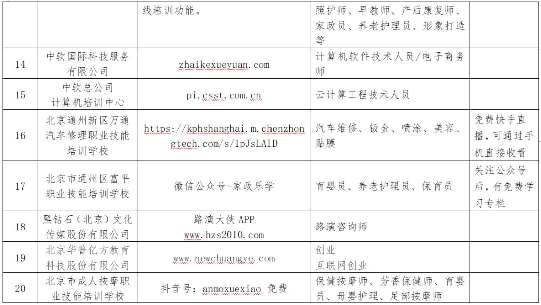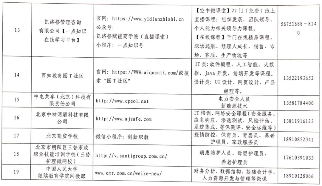 今年的3月,北京公布了两批免费的技能培训线上教学课程,首批共23家线上培训平台、第二批共28家线上培训平台,涉及IT类、设计类、工商管理等多个类目的课程,线上就可学、还免费,没找到工作的小伙伴可以看看这些课程充实一下自己。